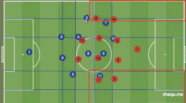 基本上在防守当中无论是边路、肋部,都没有足够的人数优势,这两个区域是可以被对方肆无忌惮地冲击的。